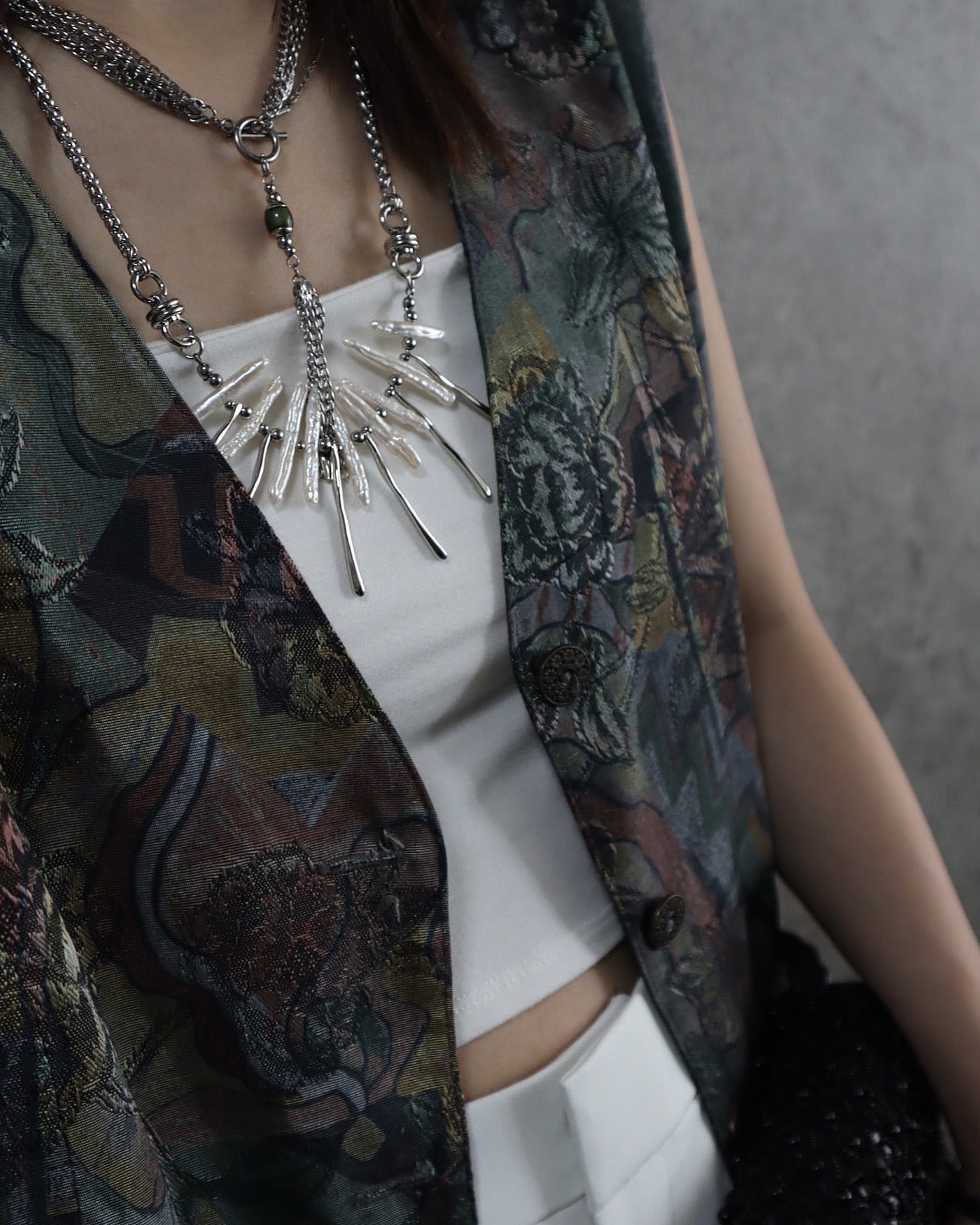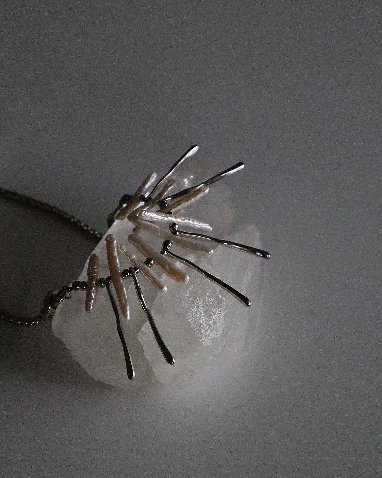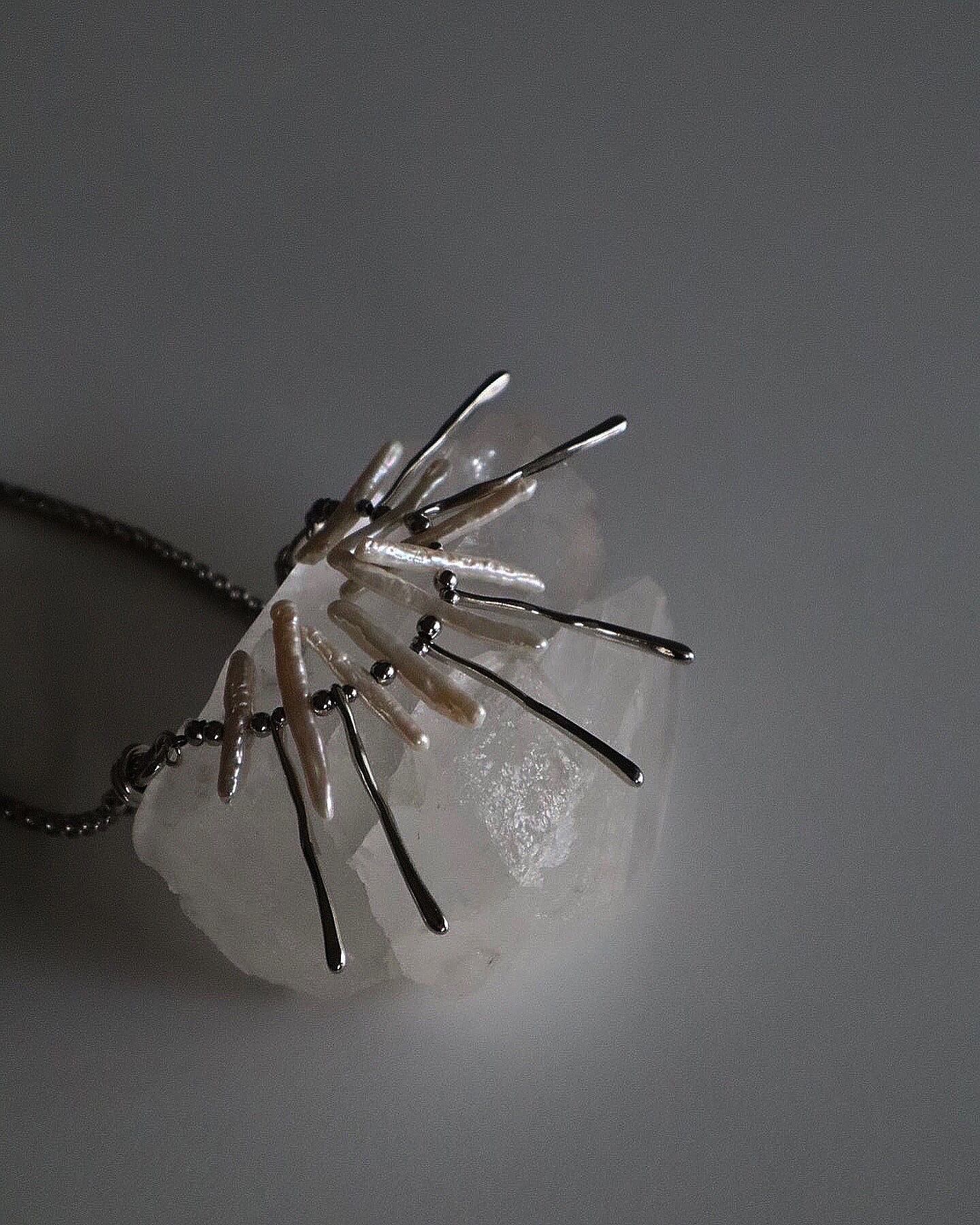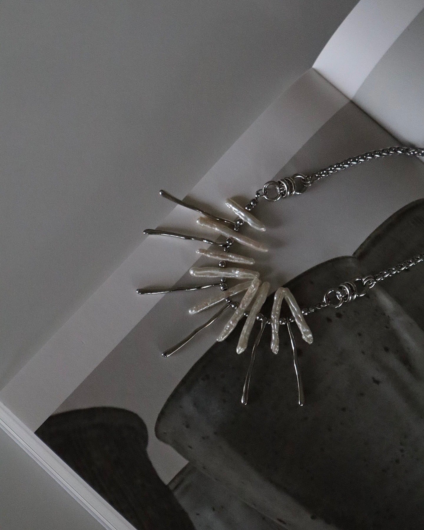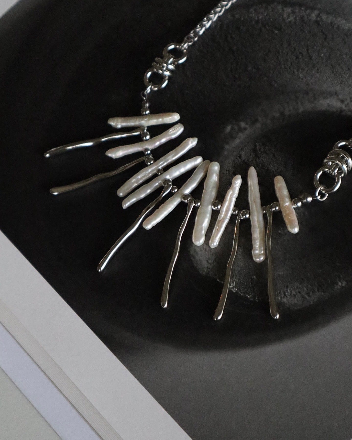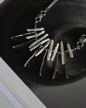 パールに合わせて歪みのあるメタルスティックを組み合わせたnew necklace。